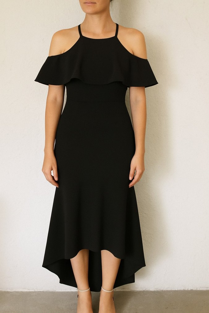 Bu siyah, vücuda oturan uzun abiye elbise, fırfırlı detayları ile özel günler için uygundur.