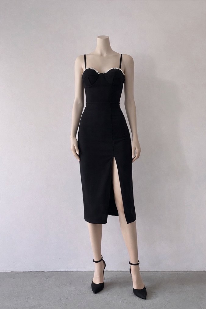 Yırtmaçlı Göğüs Çevresi Taş Detay İnce Askılı abiye elbise tek devamı yok iç dış etiket kesik