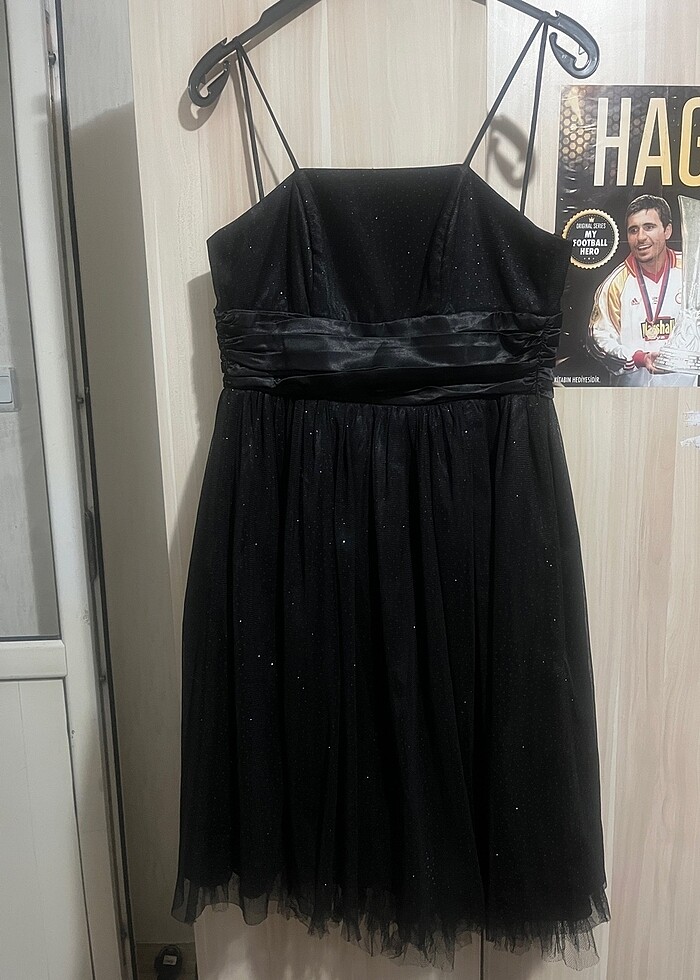 Elbiseyi bir kez giydim sadece diz boyunda ışıl ışıl beli saten kumaş. Fermuarı son fotoğrafta gösterdiğim yerden çıkıp düşmüş tek sorunu o ufak bi yeni fermuar dikilmesi lazım bunun için fiyatı düşük tutacağım