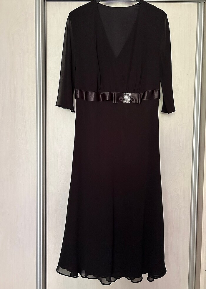 Siyah, taşlı fiyonk detaylı kısa kollu abiye elbise, etek boyu omuzdan 110 cm