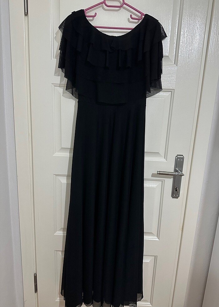 Kayık yaka omuzları açık üstü tük detaylı altı da tül içi siyah astarlı sadece 2 kere giyildi