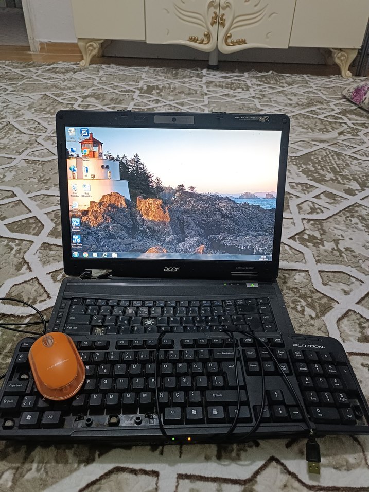 Siyah Acer dizüstü bilgisayar, dahili web kamerası ile birlikte kablolu klavye ve turuncu renk kablosuz fare içerir. FOTODA GORULDUGU GİBİ JARZA TAKİP KULLNİLİYOR