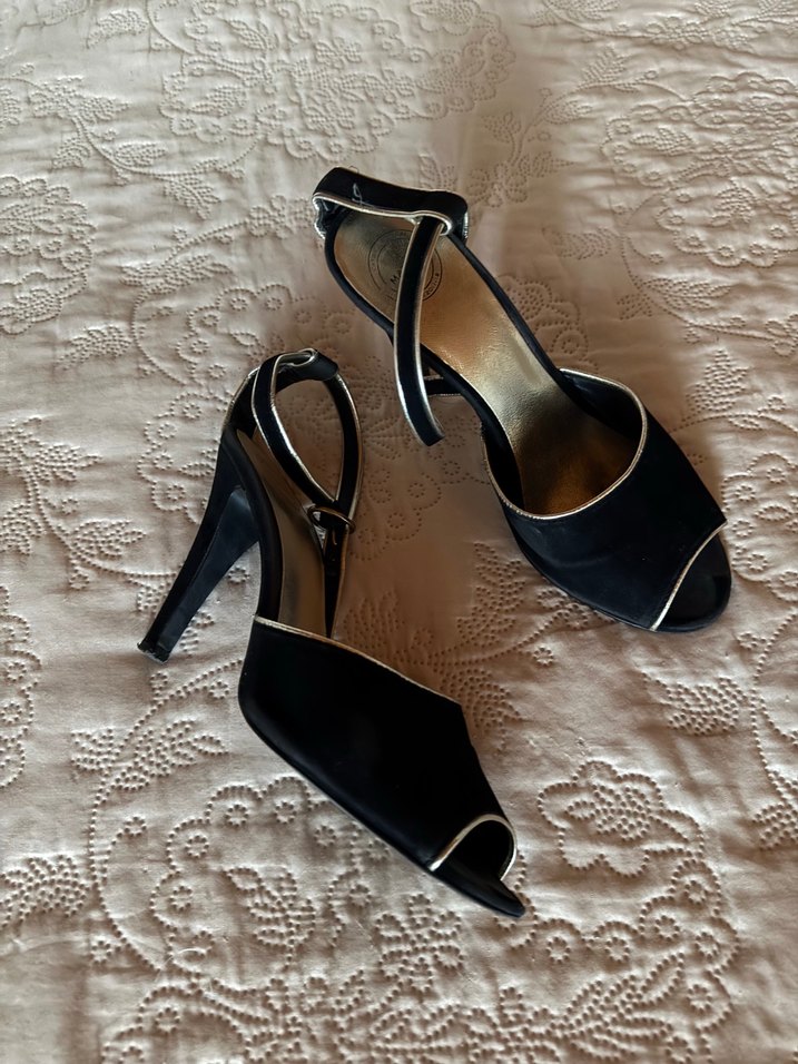 Tokalı kayışlı, burnu açık siyah stiletto topuklu ayakkabılar. Klasik gotik tarzda, düğünler için uygun, açık burunlu ve desensiz tasarıma sahip.