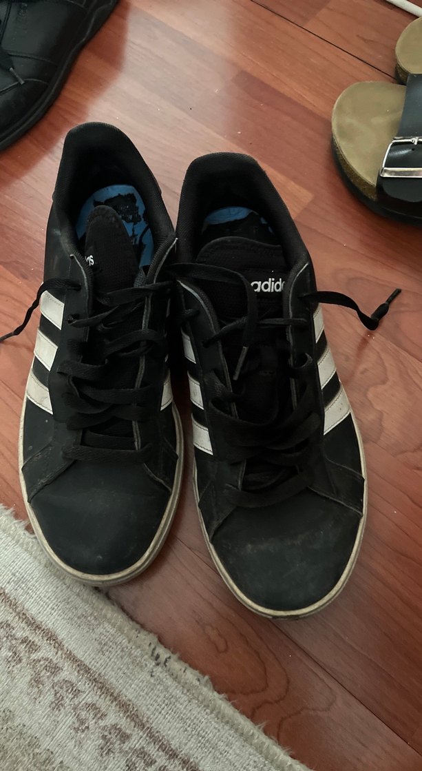 Siyah Adidas erkek spor ayakkabısı, beyaz çizgili, bağcıklı ve kauçuk tabanlıdır, sokak stili ve spor için uygundur. Biraz temizlenirse çok rahat kullanılabilir 41,5 numara