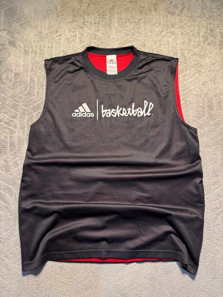 Siyah Adidas kolsuz spor tişörtü, önünde baskılı basketbol logosu bulunur. Sentetik kumaştan üretilmiş, bol kesim ve sokak stili sunar.