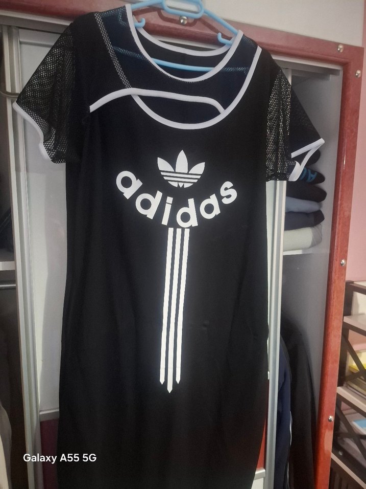 Kısa kollu, bisiklet yaka ve Adidas baskılı siyah elbise. Elastik sentetik kumaştan, rahat ve günlük kullanıma uygun.