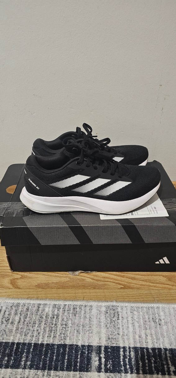 Siyah Adidas erkek koşu ve antrenman ayakkabısı, baskılı tasarım, cırt cırtlı kapama ve rahat kauçuk taban ile spor ve günlük kullanım için uygundur.