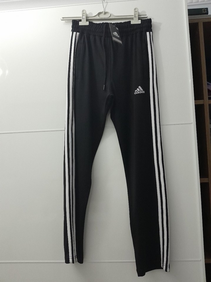 Siyah Adidas eşofman altı, elastik bel ve beyaz yan çizgilerle, spor için uygun sentetik kumaştan üretilmiş dar kesim model.