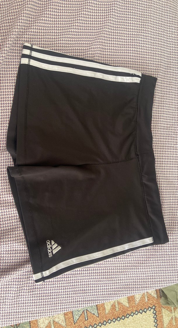 Siyah Adidas marka, elastik belli, sentetik kumaştan üretilmiş, düz ve dar kesim midi spor şort. Athleisure ve streetwear tarzına uygun.