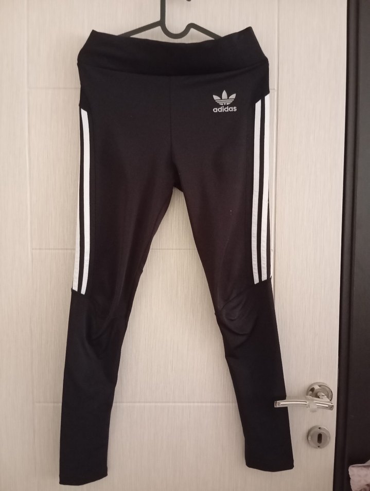Siyah Adidas tayt, elastik bel bantlı, yanlarda beyaz şeritler ve vücuda oturan kesimle spor ve günlük kullanıma uygun.