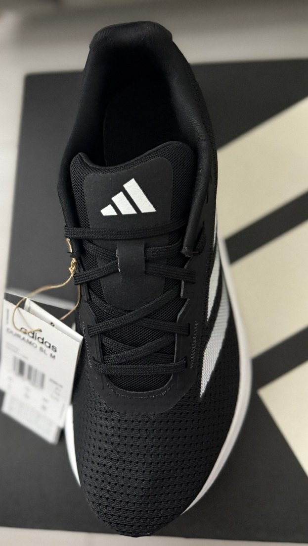 Siyah Adidas erkek 42.5 43.5 koşu ve antrenman ayakkabısı, bağcıklı ve baskılı desenli, sokak stili ve spor için uygundur. Dayanıklı kauçuk tabanlı.