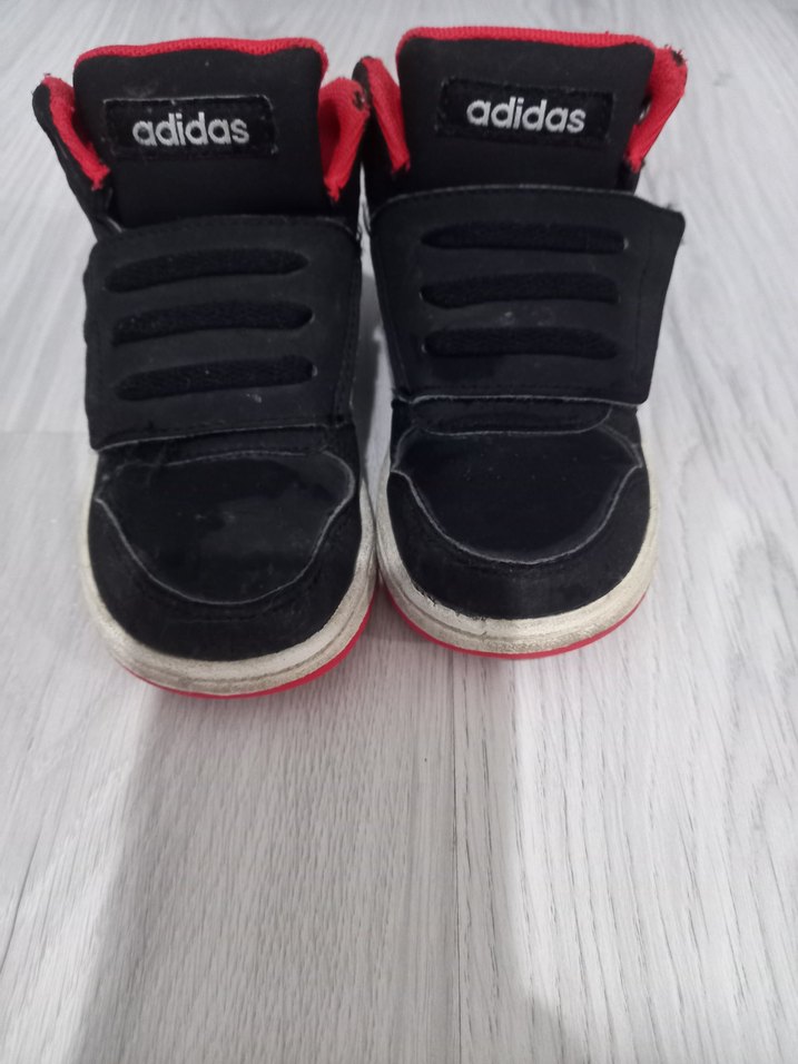 Siyah Adidas erkek çocuk spor ayakkabısı, velcro bantlı ve kauçuk tabanlı, sokak stili ve rahat kullanım için uygundur.
