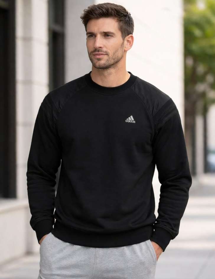 yeni gibi ikikol arası 54cm.boy.64cm Siyah Adidas sweatshirt, uzun kollu ve yuvarlak yakalı, yumuşak ve sıcak kumaştan, rahat ve bol kesim. Spor ve gündelik tarz için uygundur.