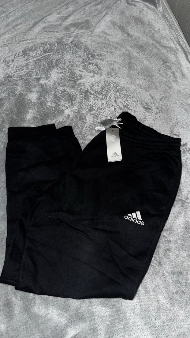 Siyah Adidas eşofman altı, bol kesim, normal boy ve fermuarlı ceplerle, yumuşak ve sıcak kumaştan üretilmiştir. Spor ve günlük rahat stil için uygundur.