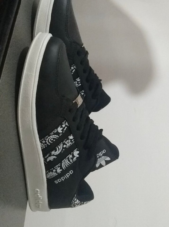 Beyaz tabanlı, baskılı detaylara ve cırt cırtlı siyah Adidas erkek/kadın unisex spor ayakkabısı, günlük kullanım için kauçuk tabanlıdır.