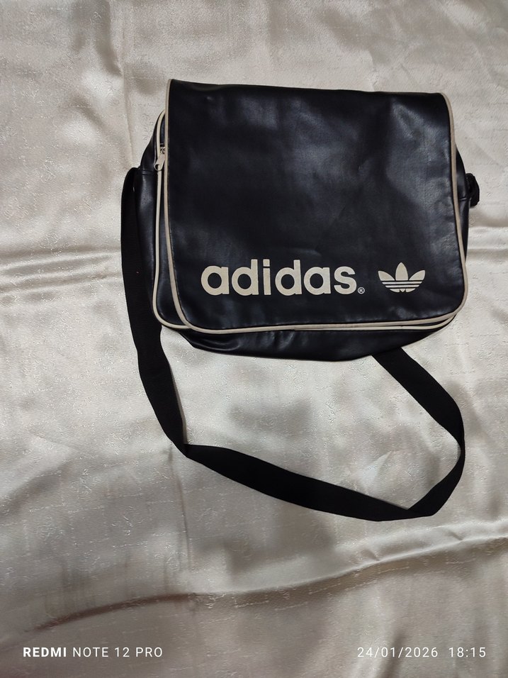 Kapitone kapaklı, baskılı logolu siyah adidas erkek omuz çantası, trend spor stil için uygun.