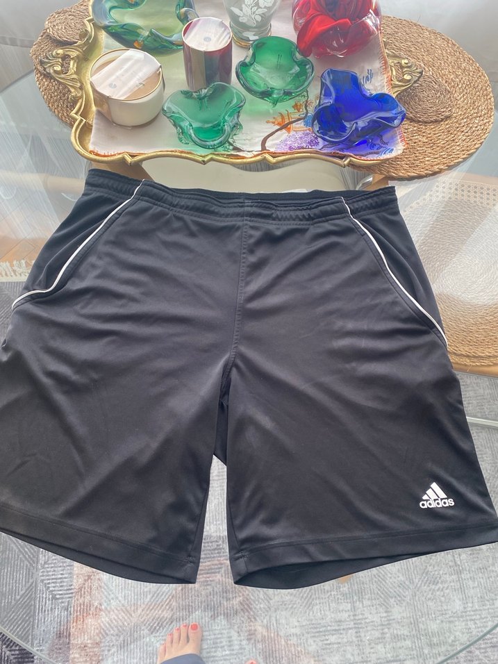 Siyah renkli, elastik bel bantlı ve beyaz şerit detaylı Adidas marka erkek spor şort. Sentetik kumaştan, rahat ve sportif tarz için uygun. ♂️
