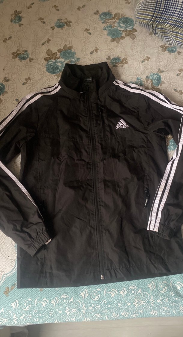 Adidas marka, siyah renkli, fermuarlı ve yüksek yakalı ceker Uzun kollu, beyaz şerit detaylı, sentetik kumaştan yapılmıştır. Orjinal üründür defosu toktur
