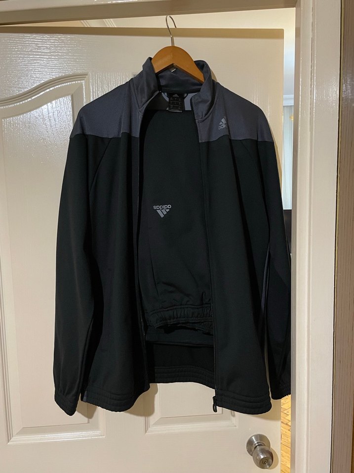 Siyah Adidas fermuarlı erkek eşofman , yüksek yakalı ve uzun kolludur. Yumuşak, sıcak kumaştan üretilmiş, desen içermeyen sade tasarıma sahiptir. tertemiz hiç kullanılmadı