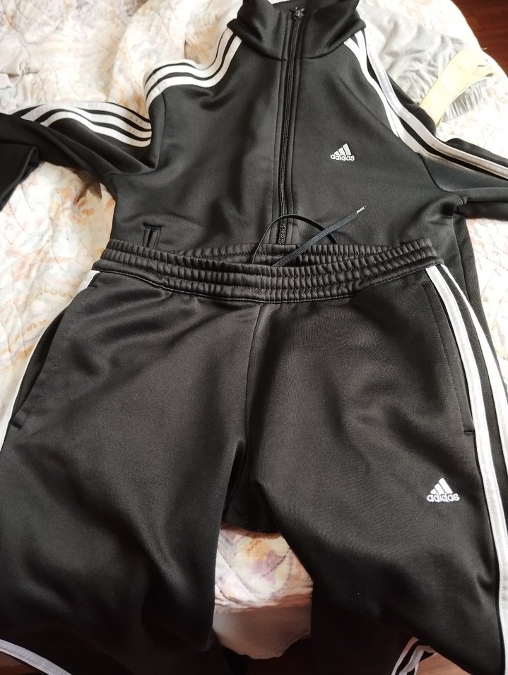 Siyah Adidas kadın eşofman takımı, fermuarlı ve yüksek yakalıdır. Strappy kollu, normal midi boyda ve sentetik kumaştan üretilmiştir. Spor ve street wear tarzına uygundur.