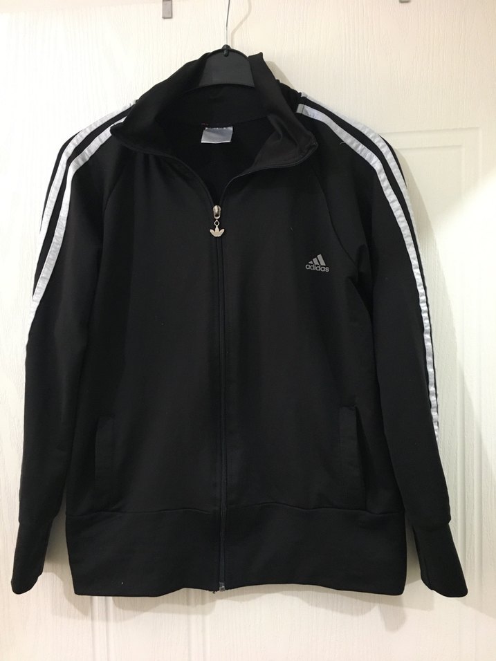 Siyah Adidas ceket, uzun kollu ve yüksek yakalıdır. Fermuarlı, normal boyda, beyaz şerit detaylı, yumuşak ve sıcak kumaştan yapılmıştır.