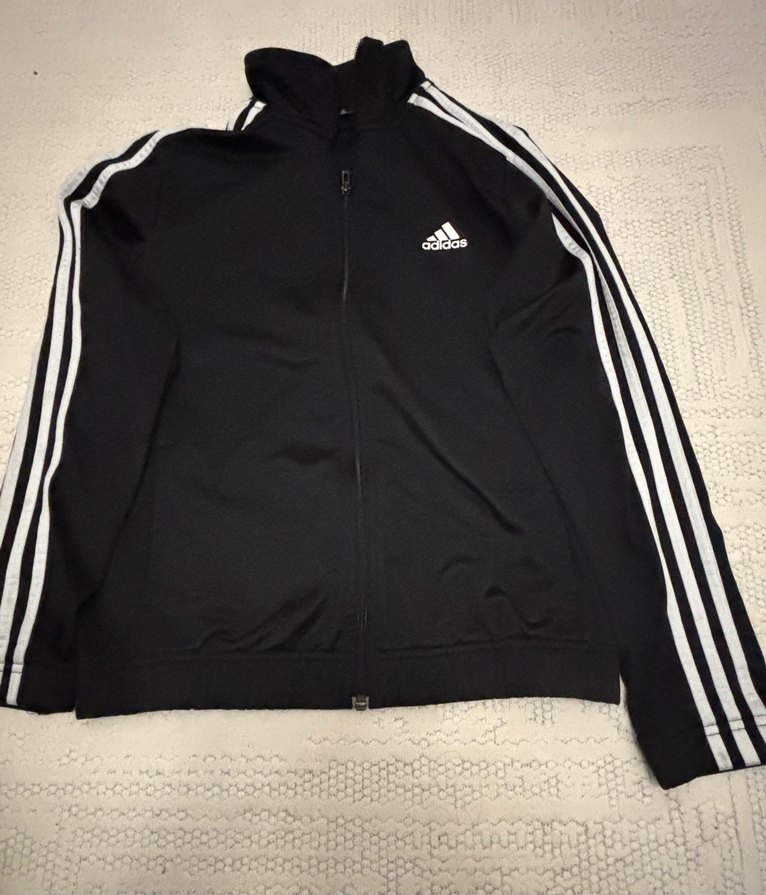 Siyah Adidas ceket ve alt eşofman takımı, uzun kollu ve yüksek yakalıdır. Önü fermuarlıdır, kollarında beyaz üç çizgi bulunur. Yumuşak ve sıcak kumaştan yapılmıştır. Etiketinde 34-36 beden yazıyor.