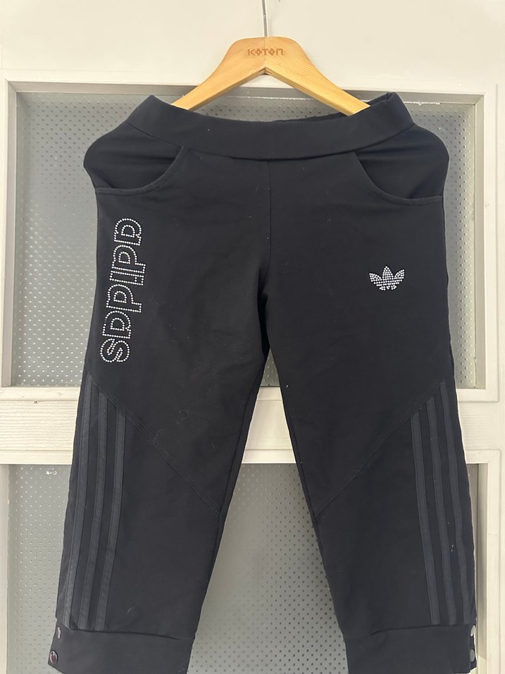 Siyah renkli, baskılı logolu ve fermuarlı cepli, rahat sentetik kumaştan yapılmış Adidas marka dar kesim eşofman altı. kapri