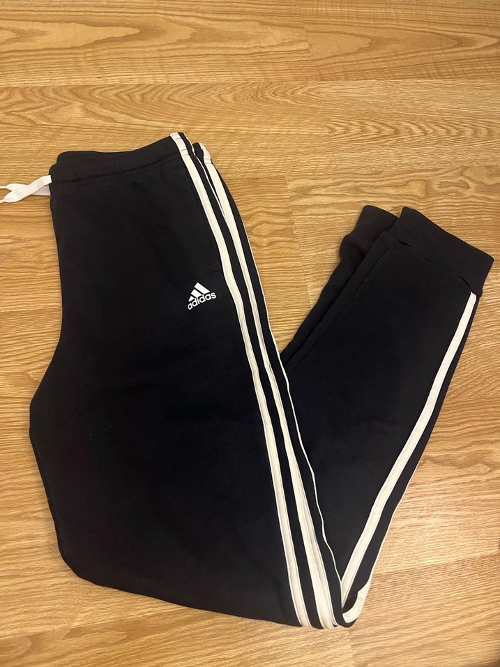 Siyah Adidas pamuklu kadın eşofman altı, dar kesim ve elastik bel bandı ile, beyaz yan çizgilerle sportif görünüme sahip.