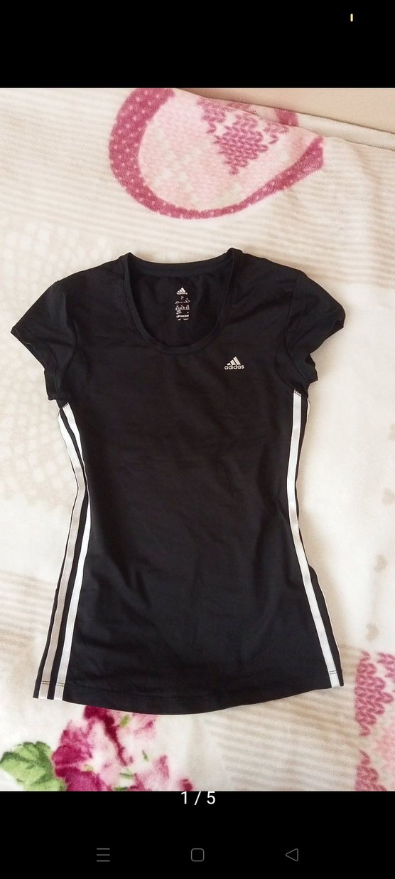 Siyah pamuklu kumaştan, kısa kollu ve bisiklet yakalı Adidas kadın spor tişörtü. Yanlarda beyaz çizgiler ve cırt cırt detayları bulunur. Spor ve günlük kullanım için uygundur.