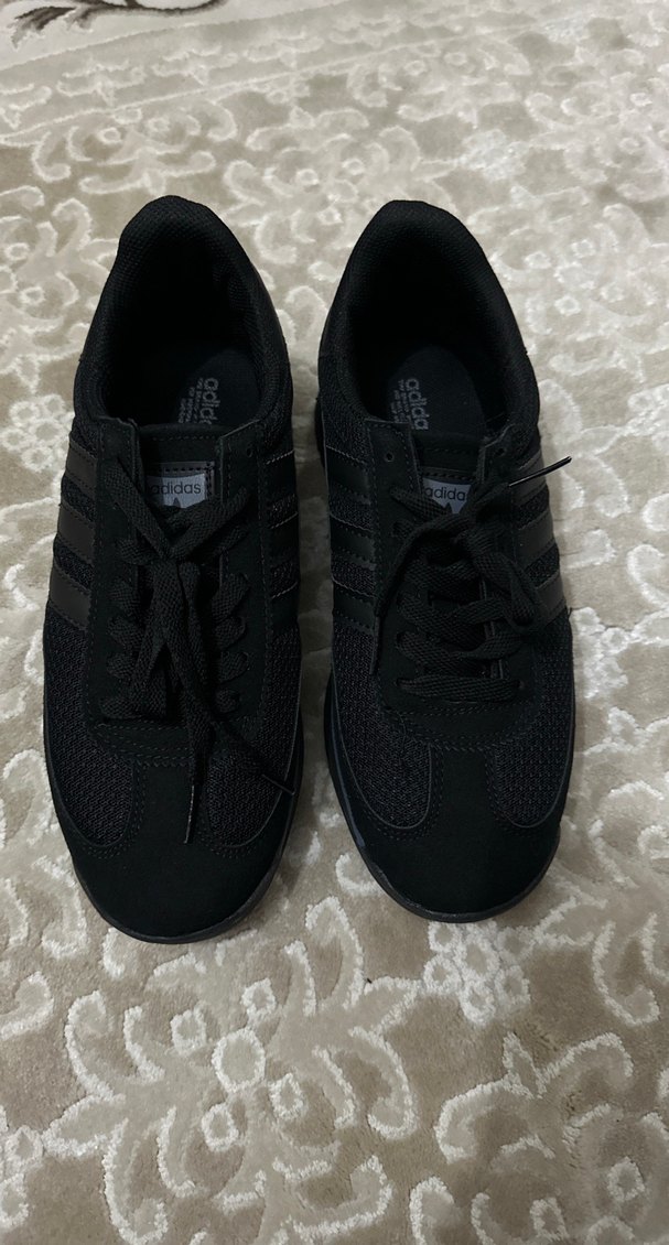 Siyah Adidas spor ayakkabısı, düz tabanlı, bağcıklı sportif ve günlük sokak stili için uygundur.