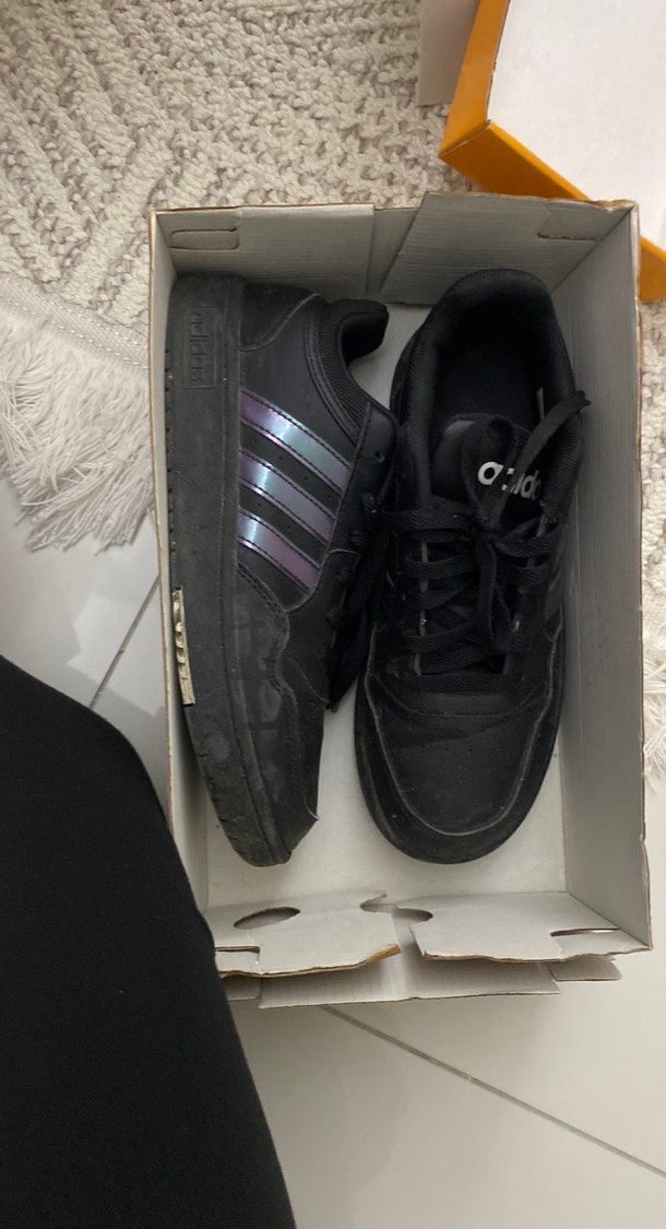 Siyah Adidas kadın spor ayakkabısı, velcro ve bağcıklı kapama, kauçuk tabanlı, sportif ve günlük sokak stili için uygun.