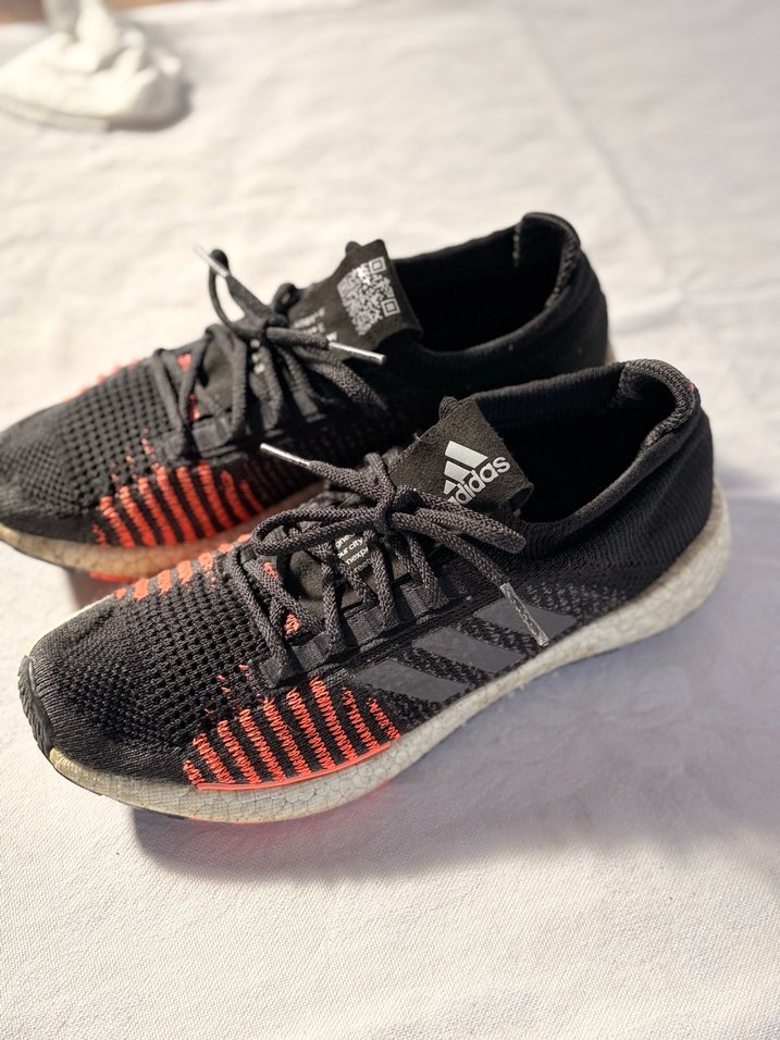 Siyah Adidas erkek sneakers, hafif örme üst yüzey ve yastıklı taban ile spor tarzda, bağcıklı tasarım.