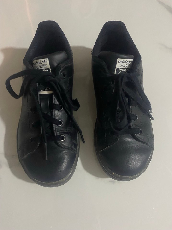 Siyah Adidas Stan Smith sneakers, lastik tabanlı, normcore tarzda, zahmetsiz şıklık ve rock punk havası sunar. Hiç bir yerinde aşınma yırtık yoktur orginal deri