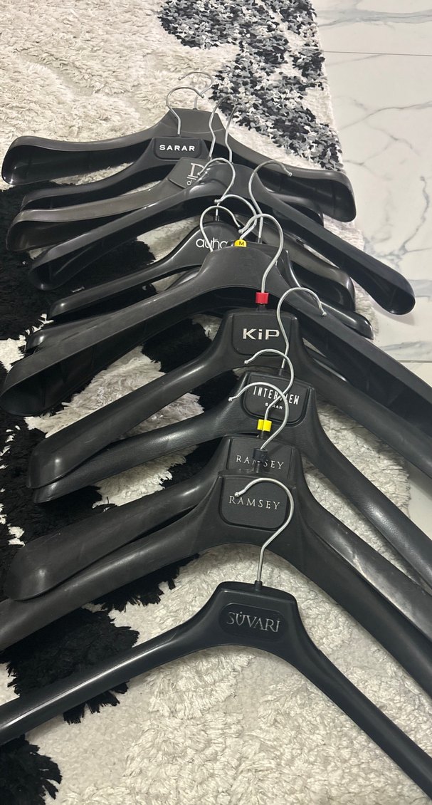 Ramsey, Suvari ve KiP gibi markaların isimlerini taşıyan siyah ahşap askılar metal kancalarla birlikte.