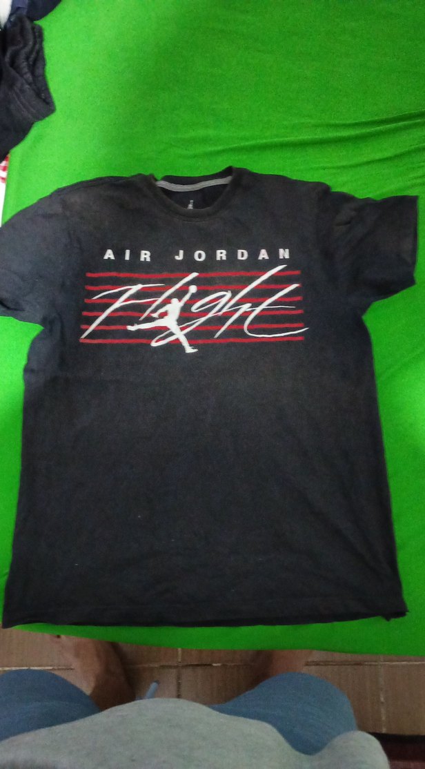 Siyah renkli, kısa kollu erkek tişörtü, Air Jordan baskılı, yuvarlak yaka ve bol kesimdir. Sentetik kumaştan yapılmıştır, sportif ve rahat kullanım için uygundur.