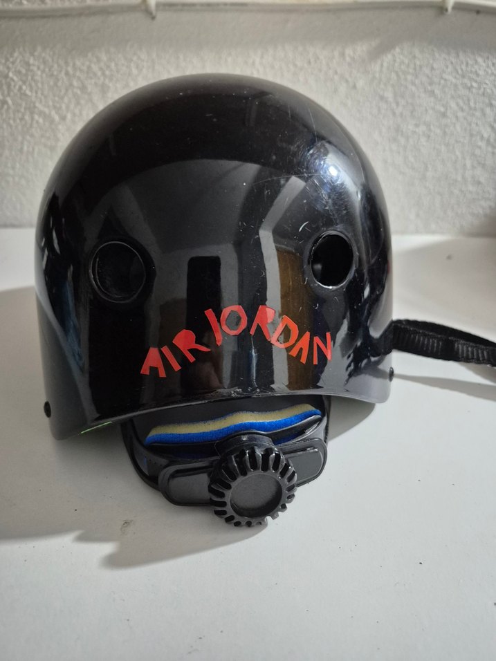 Siyah renkte, Air Jordan baskılı plastik biker kask. Velcro kayışlarla güvenli kullanım sağlar, grunge punk tarzına uygundur. ️