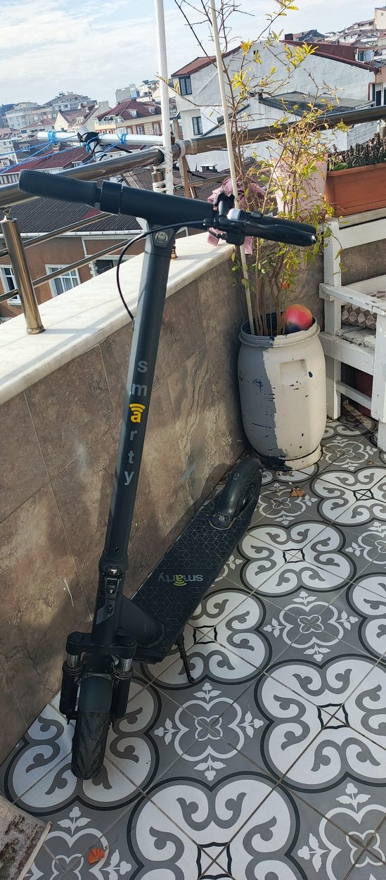 Siyah renkli çocuk scooter'ı dayanıklı yapıya ve kaymaz tabana sahiptir, desenli zeminlerde rahat sürüş sağlar. 3 vites katlaması çok pıratik scooter Türcell in sattıgı ürün 13,5 kg en hafif 10 inç teker şehir içi kısamesafe kullanılır menzil 15" 20 kilometre gider şu anki aliyle üç tane hız modu var dır birinci mod 6 ikinçi mod 20 üçün çü mod 25 batarya durumu çok iyi tek şarz LA denedim 2 saat durmak sızın gezdim ama şu an arızalı herşeyi çalışıyor ekran geliyo yannız gaz verince teker tak Tay yapıp duruyo gitmiyo neyi var bilmiyorum kablosu falan bir yerden çıkmış olabilir oyüzden fiyatı uygun tuttum alan bir baktır sın diye