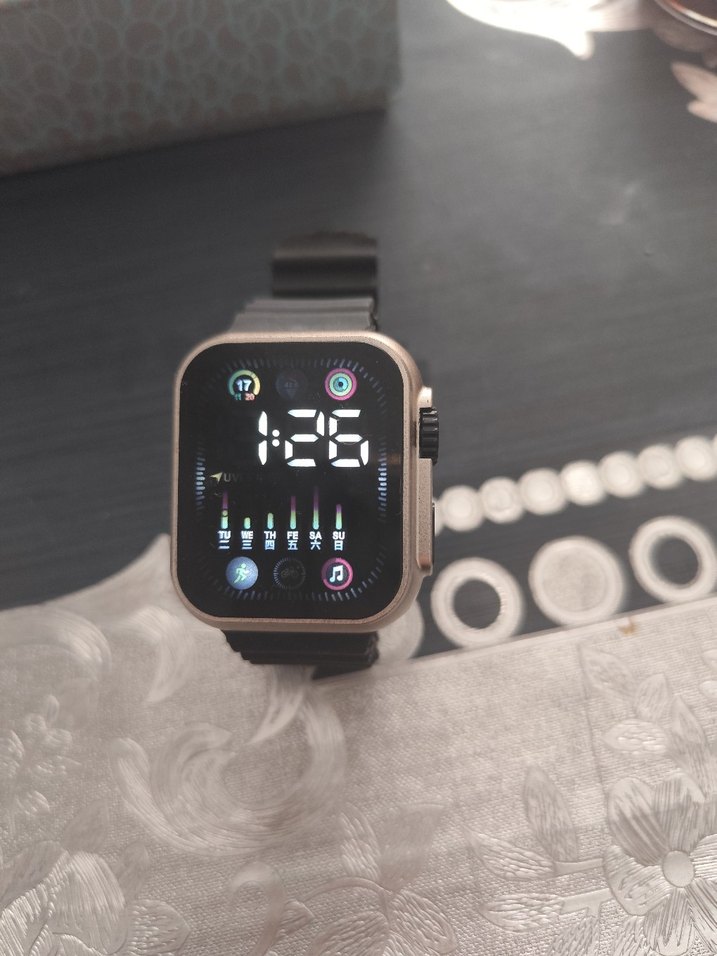 Dijital ekranlı, yan düğmeli siyah akıllı saat. Koyu renk kayış ve çeşitli aktivite simgeleri bulunur. ⌚