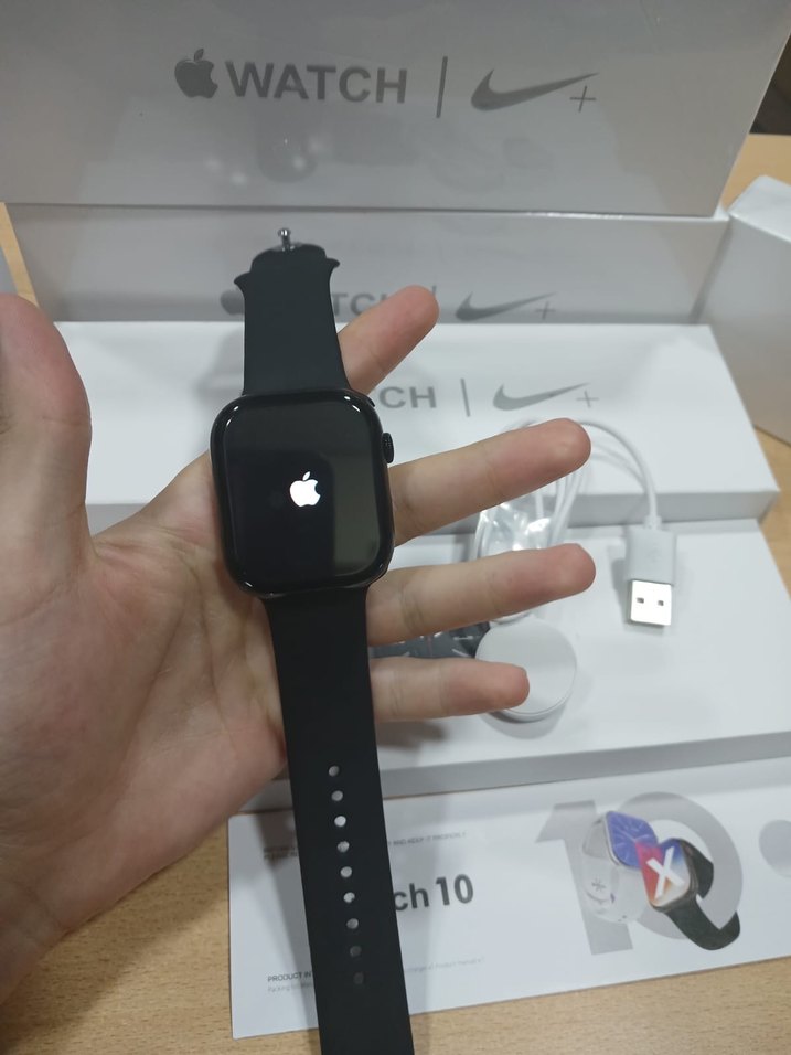Siyah silikon kayışlı Apple Watch Nike Serisi 10, şık tasarımı ve akıllı özellikleriyle dikkat çekiyor. Şarj kablosu dahil. ⌚