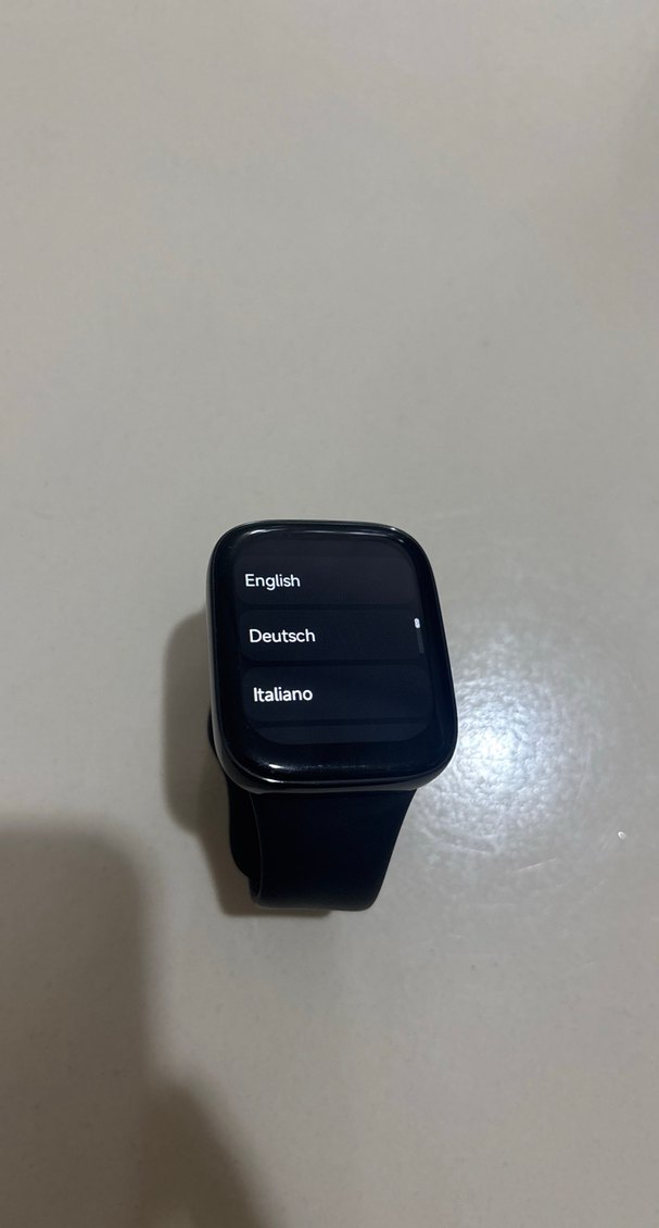 Siyah kayışlı akıllı saat, Almanca, İngilizce ve İtalyanca dil seçenekleri sunar. Net dijital ekranı vardır. ⌚