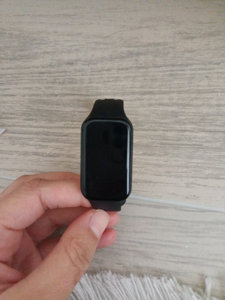 Dikdörtgen ekranlı siyah akıllı saat, rahat kayış ve şık tasarıma sahip.⌚ Kordon da defo vardır yapıştırdım şuan. Alıcıya şarj aleti ile göndereceğim. Sadece titreşimi bozuktur. ! saat şarj alıp çalışmaktadır.