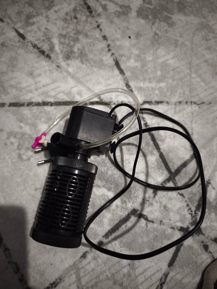 Kompakt tasarımlı siyah akvaryum su pompası, su sirkülasyonu için kablo ve hortumla birlikte. Akvaryumlarda su akışını sağlar.