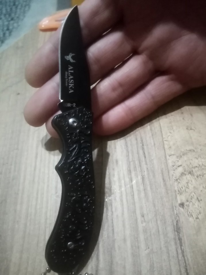 Alaska marka siyah katlanır bıçak, desenli sap ve kıvrımlı bıçağa sahiptir. Kompakt ve taşınması kolaydır.