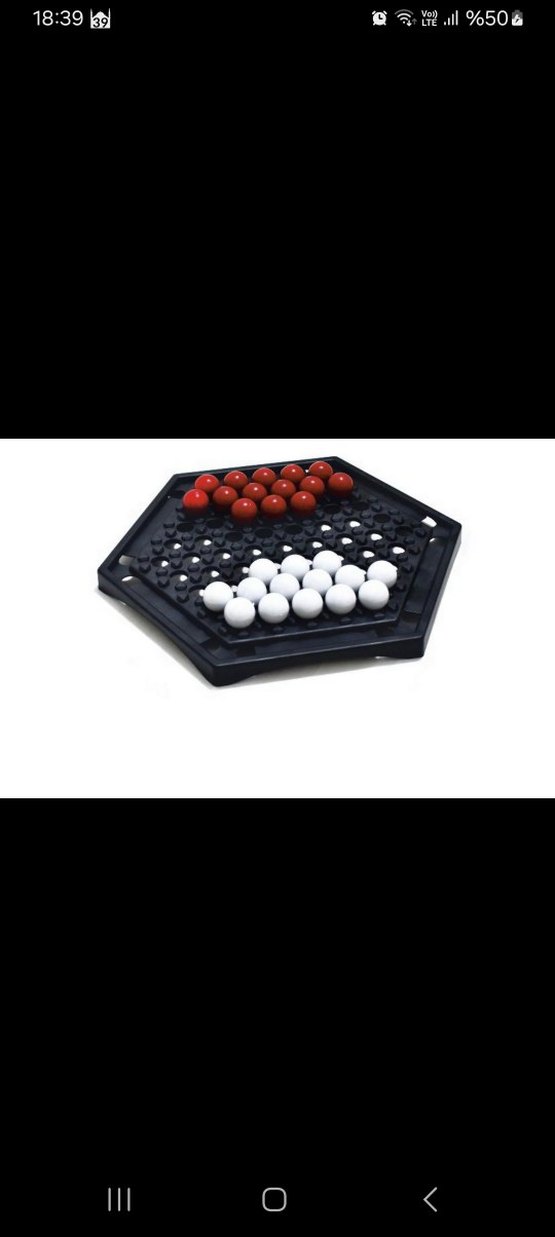 Kırmızı ve beyaz toplarla siyah altıgen zeka oyunu, stratejik düşünceyi geliştirmek için tasarlanmıştır.