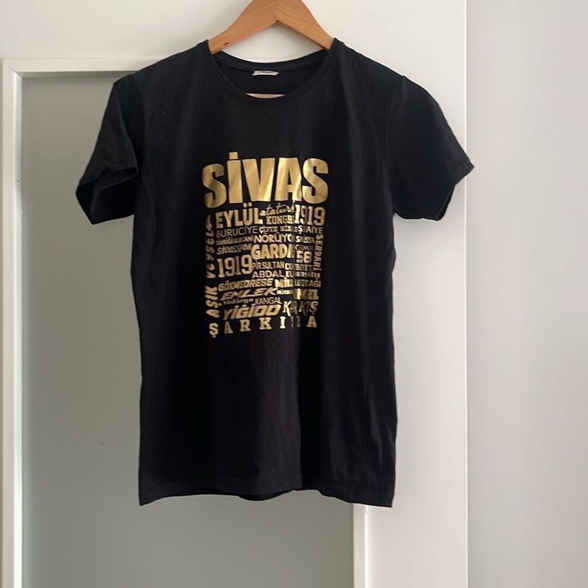 Siyah, altın baskılı grafik detaylı, kısa kollu, bisiklet yaka, süet dokulu kadın tişörtü. Günlük kullanıma uygun, fitted kesim. ✨ Pamuklu, üstü baskılı harika bir tişört, bedeni uyan ve Sivaslı olan kaçırmasın, iki koltuk arası 45 cm boyu 63 cm iki kere giyilmiştir, yıkandı üstündeki baskı çıkmaz