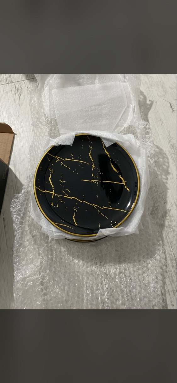 Parlak yüzeyli, altın çizgili siyah modern tabak, sofranıza şıklık katar. ️