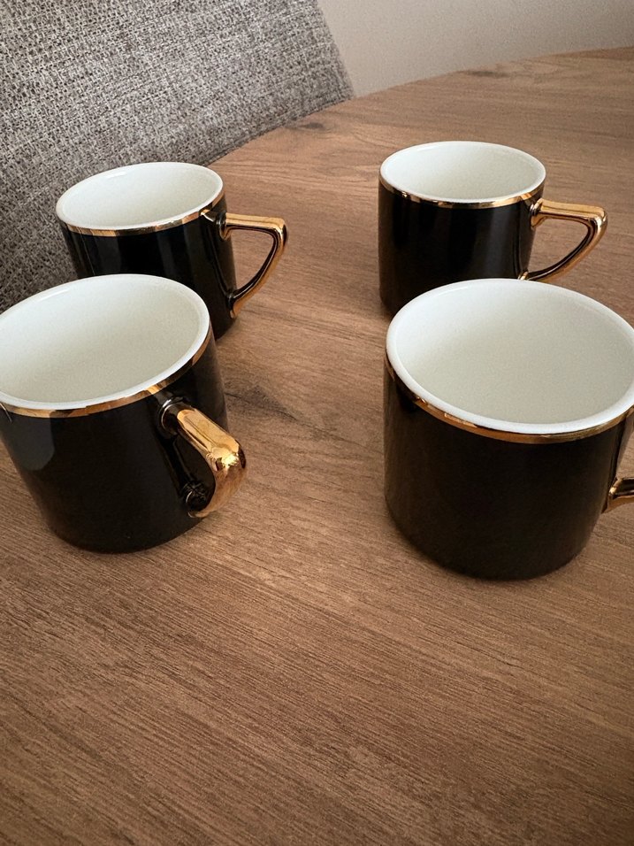Dört adet siyah kahve fincanı, altın sap ve kenar detayları ile. İç kısmı beyaz ve pürüzsüzdür. Karaca markadır cok iyi durumdadır