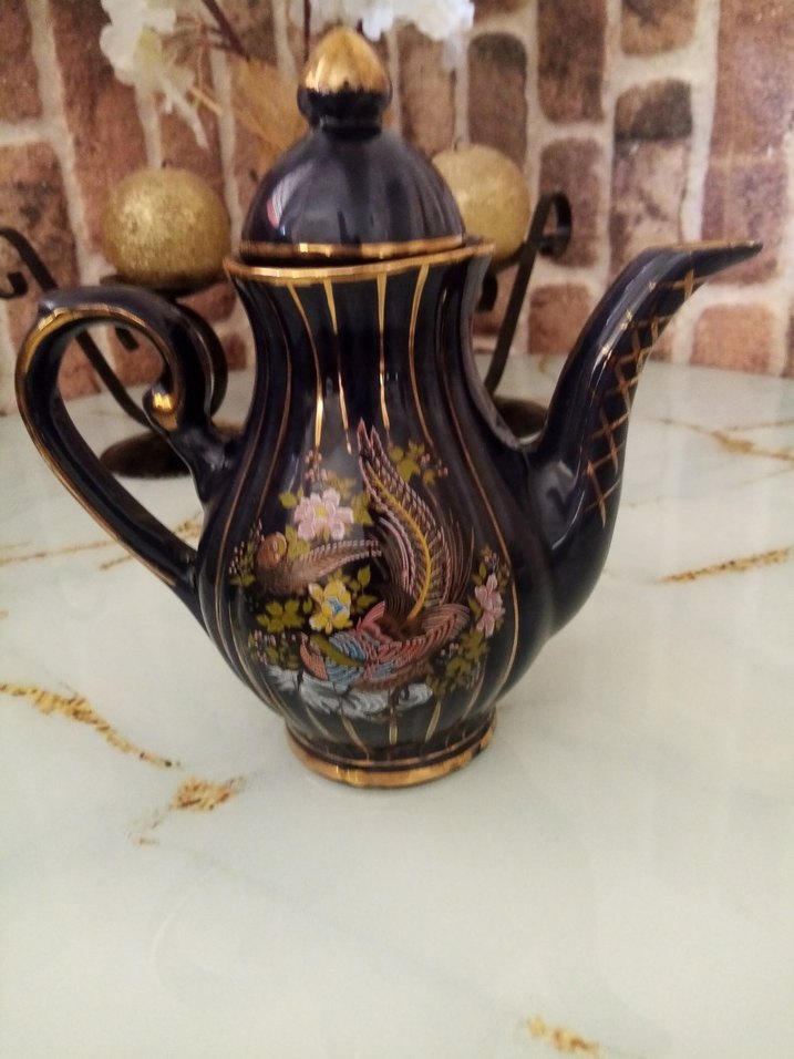 Siyah Altın Detaylı Çiçekli Demlik-Sütlük
