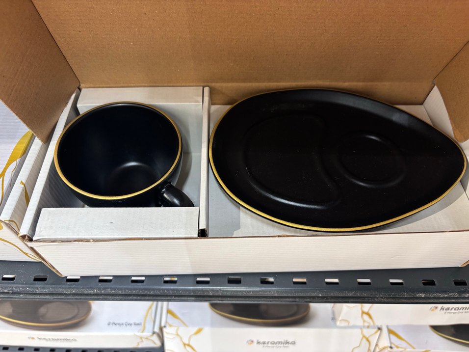 Altın kenarlı siyah fincan ve tabak seti. Set, uyumlu tabak ve fincandan oluşur, şık ve koyu renklidir. ☕