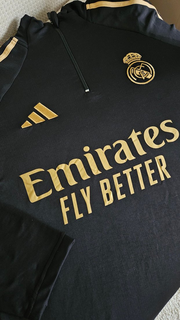 Siyah renkli sweatshirt, koyu altın tonlarında Real Madrid rozeti ve Emirates Fly Better baskısı ile sade, biker tarzında tasarlanmıştır. ️